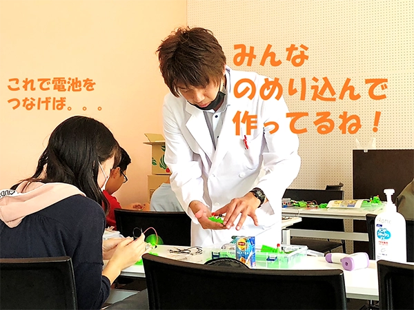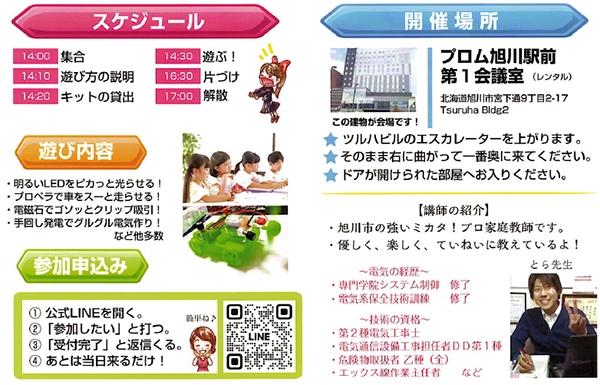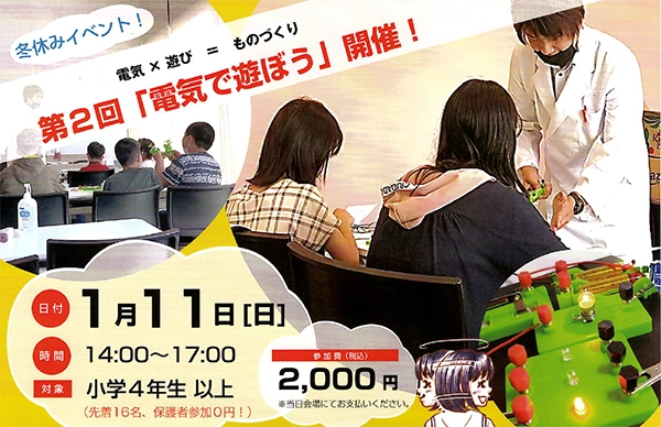 ひさびさ開催です!小学4年生以上のみなさんは、電気回路を作って豆電球を光らせるゲームをしたり、プロペラ車をスイーッと走らせます。なお、6年~中学生なら個人で自由に遊べる空間もありますよ♪